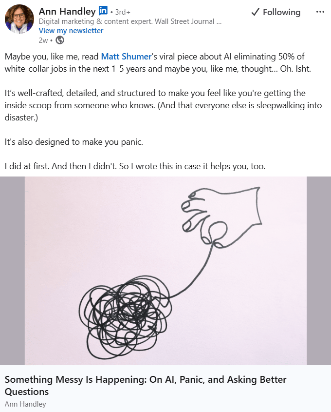 👀 Seen on socialIt’s hard to escape the constant online chatter about how AI is coming for our jobs. 🙄 AI may be more efficient at creating content than we are, she says, but our value in the workplace goes well beyond speed. And speed obviously isn’t the only measure of value, nor the most important one. Good food for thought as Michelle and I put together the program supporting the Clarity at the Flashpoint theme at our annual forum in June. “AI can't sit in the room when the CEO wants to pivot the entire strategy three weeks before launch. It can't rebuild trust with a customer after a PR crisis. It can't read the culture and know that this is the wrong time to be clever. It can't take accountability when the campaign fails. It can't lead that team.” |